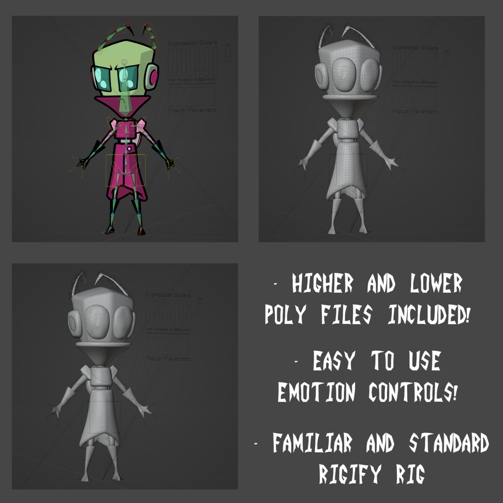 You'll get a fully posable Rigify Rig of a generic Irken Navigator from the Nickelodeon cartoon Invader Zim